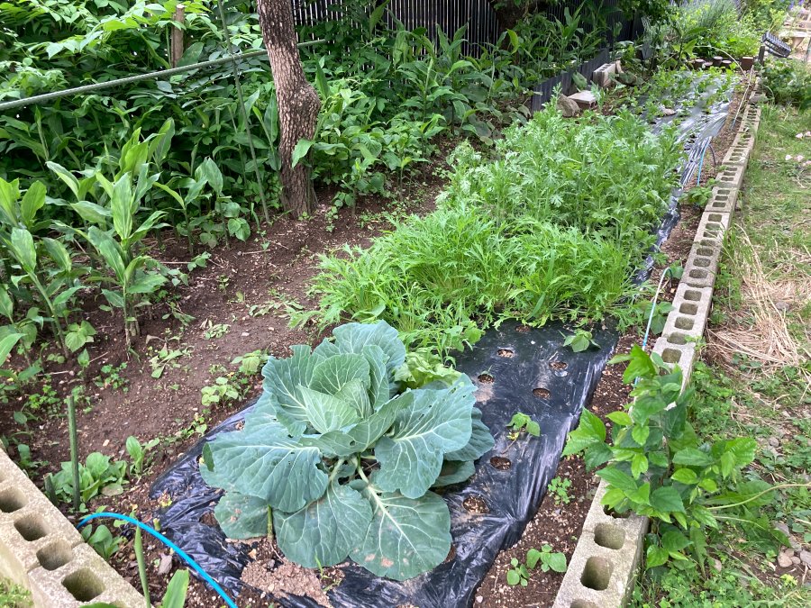 菜園の野菜が大きくなりました。行灯の中の野菜も大きくなってきたのでそろそろ行灯を外します。