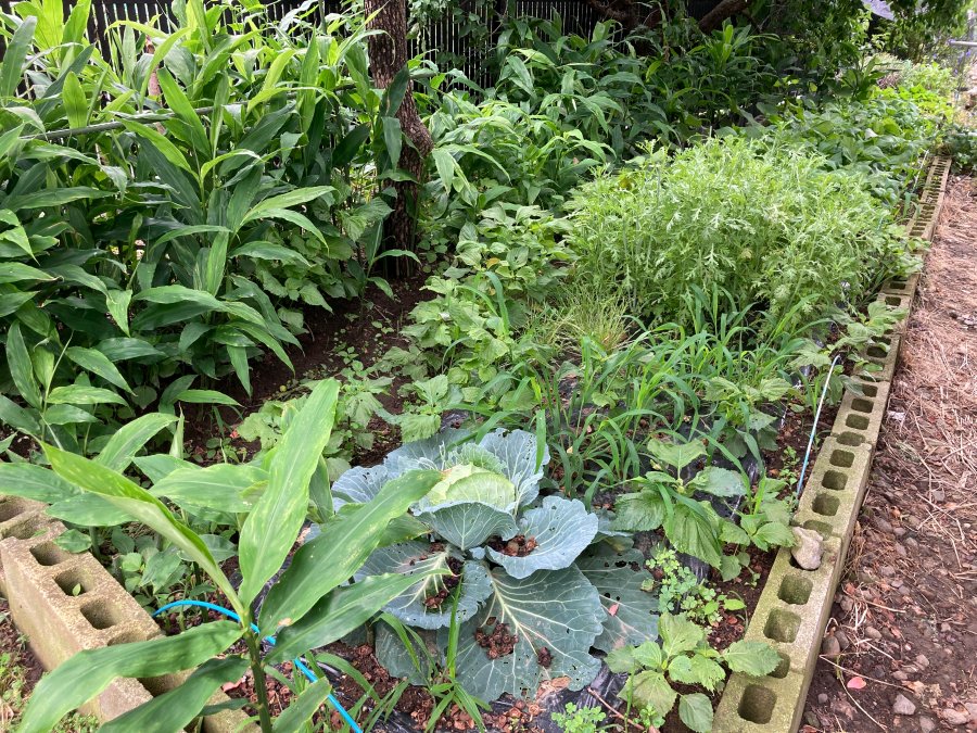 B菜園の野菜が大きくなりました。真ん中は6月中旬に蒔いたエダマメです。