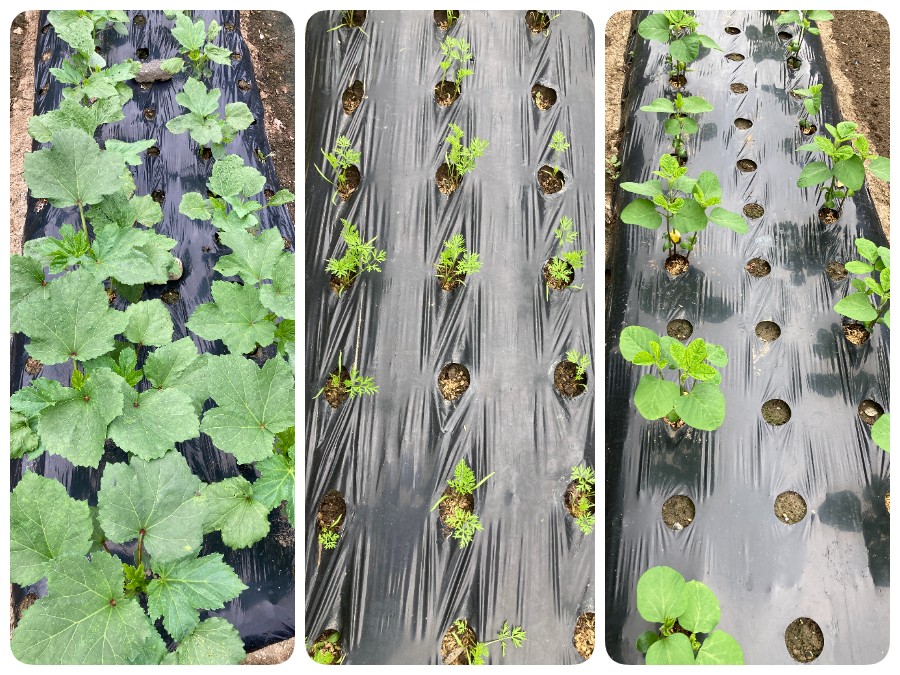 6月に入ってからオクラ・ニンジン・エダマメ(左から)の種まきをしました。発芽順調です。