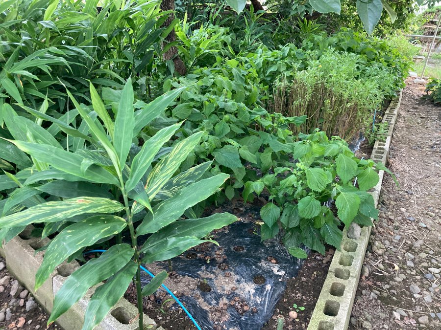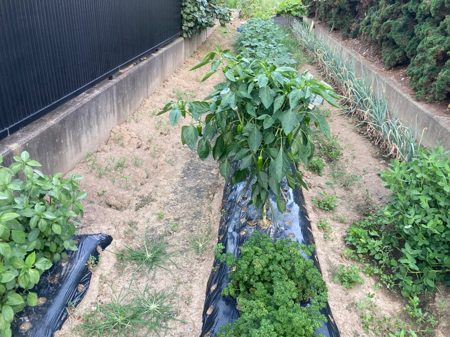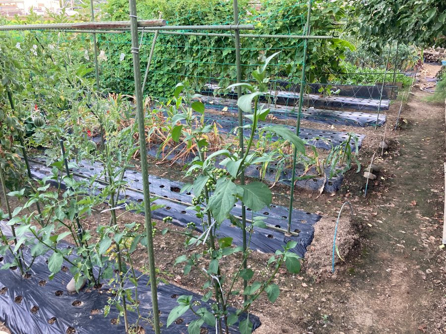 野菜が大きく育ってきました。手前のピーマンやモロヘイヤは収穫真っ最中です。