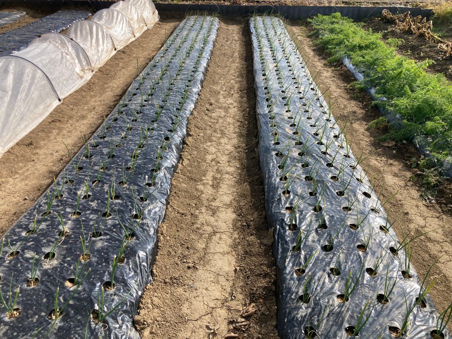 11月初旬に植えたタマネギの様子です。右のニンジンは収穫適期になりました。