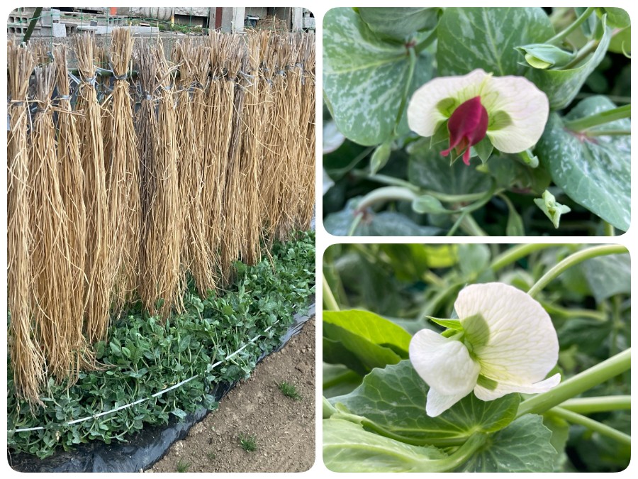 エンドウマメの不織布をとって棚を作り、ワラを垂らしました。既に花が咲いています。
