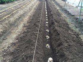 25cm間隔で種イモを植え溝の中に置いて間に堆肥を一掴み置きます。