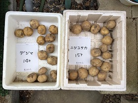 秋作ジャガイモは「デジマ」又は「ニシユタカ」を植えます。植え付けるタイミングが重要で暑すぎると種イモが腐ってしまい、寒すぎると生育に必要な時間が不足します。平均気温が25℃を下回る8月下旬に種イモを植えます。